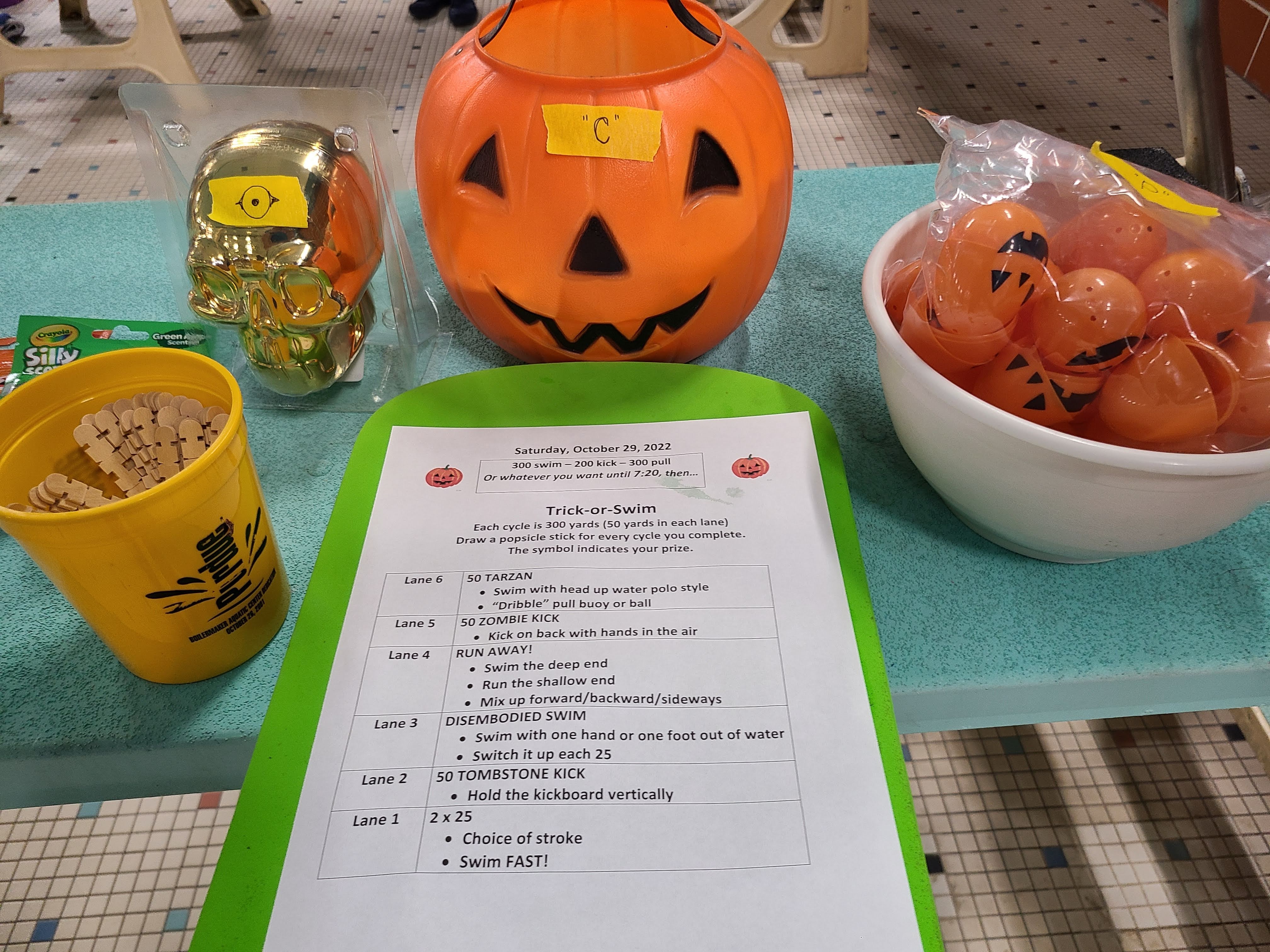 If you didn’t come swim this morning, you missed a fun one. Each circuit consisted of a drill or kick in each of the 6 lanes. Each circuit completed gave you a chance to draw for a prize.