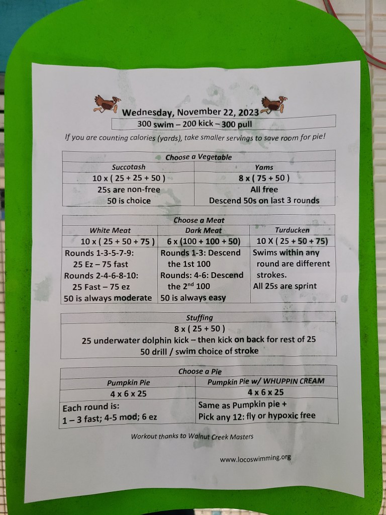 I needed some inspiration for this morning’s workout, so I lifted one posted on swimswam.com a few years ago by the Walnut Creek Masters
