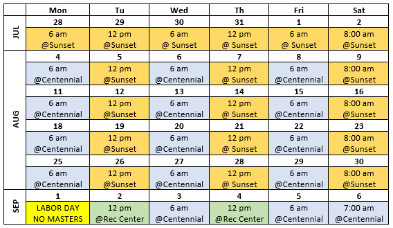 This year will be a little different. Weekday morning masters will be moving inside to Centennial at the start of August. Noon-time masters won’t be moving back to the Rec Center until after Labor Day. Saturday morning masters will switch back to 7 am to 8 am at Centennial after Labor Day. Here’s the summary: